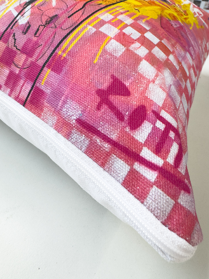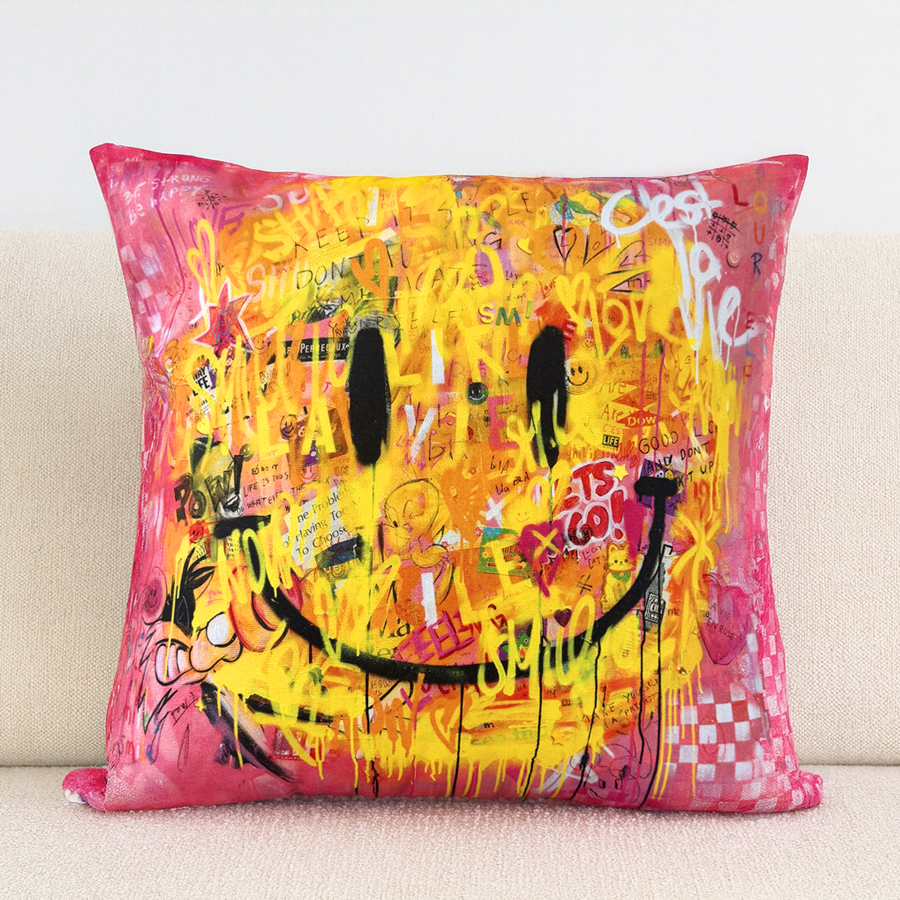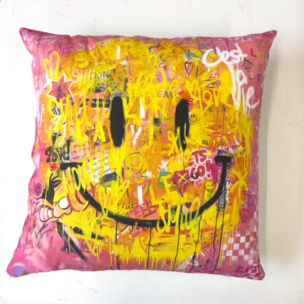 Dieses exklusive Kissen stammt aus meiner Kunstserie Smile to Life und bringt Farbe, Energie und positive Vibes in jeden Raum. Jedes Stück wird in der Schweiz von Hand genäht – ein echtes Handmade-Unikat, das Kunst und Komfort verbindet.