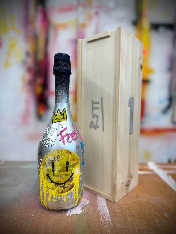 Smile to Life Design auf eine Prosecco Flasche, lackiert.