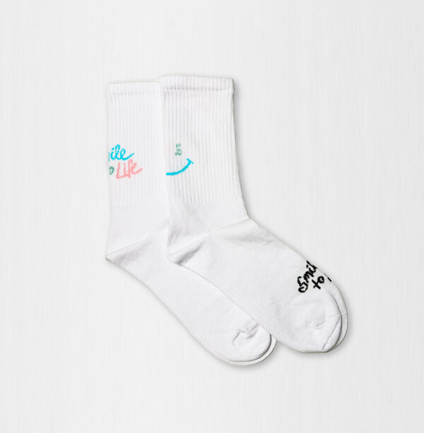 Diese Socken sorgen für positive Vibes und zaubern dir ein Lächeln ins Gesicht! Der fröhliche «Smile to Life» Schriftzug sticht in 3 Farben auf der Rückseite, auf der anderen Seite der Smile 🙂 – ein kleines Detail, das dir und deinen Mitmenschen sofort gute Laune bringt.